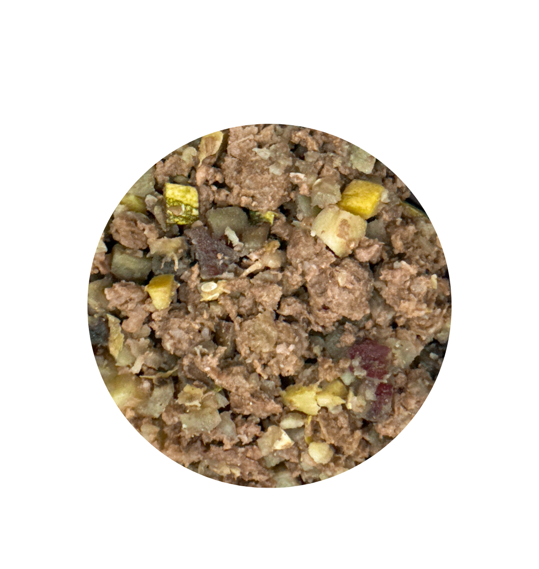 Composição básica: Carne de Avestruz, Batata Doce, Abobrinha, Chuchu, Óleo de Girassol, Óleo de Linhaça, Sal, Ácido Fólico, Ácido Pantotênico, Biotina, Calcário Calcitico, Colina, D- Pantotenato de Cálcio, D – Alfa – Tocoferol, Extrato de Alecrim, Extrato de Chá Verde, Farinha de Algas, Iodato de Cálcio, Niacina, Oxido de Zinco, Selenito de Sódio, Sulfato de Manganês, Sulfato de Ferro, Sulfato de Cobre, Vitamina A, Vitamina B1, Vitamina B2, Vitamina B6, Vitamina B12, Vitamina C, Vitamina D3, Vitamina E, Vitamina K3, Zéolita.