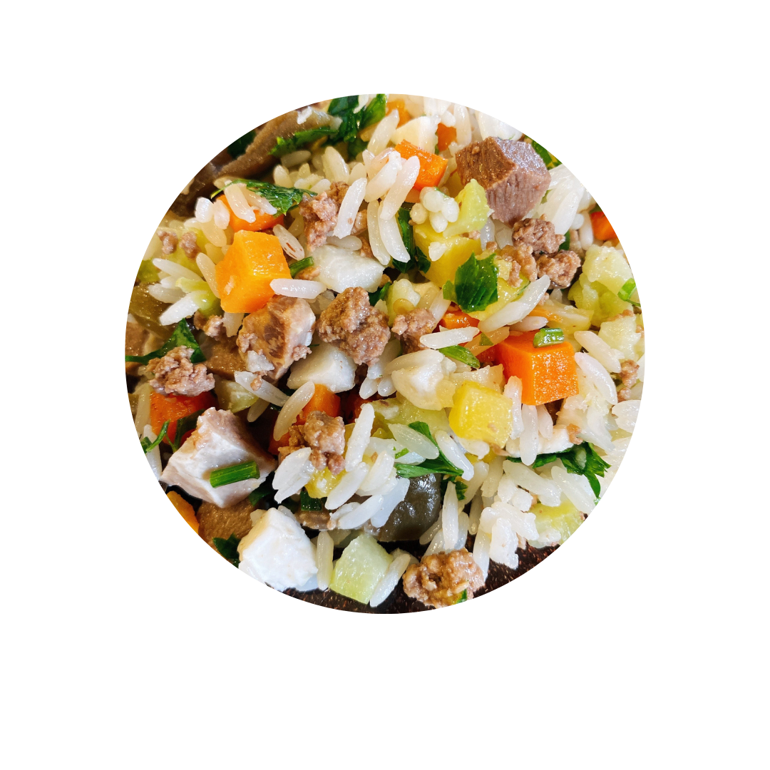 Composição básica: Coração de Bovino, Língua de Bovino, Arroz Parboilizado, Abobrinha, Cenoura, Chuchu, Tomate, Óleo de Girassol, Óleo de Linhaça, Salsinha moída, Sal, Ácido Fólico, Ácido Pantotênico, Biotina, Calcário Calcitico, Colina, D- Pantotenato de Cálcio, Fosfato Bicálcico, D – Alfa – Tocoferol, Dióxido de Silício, Extrato de Alecrim, Extrato de Chá Verde, Farinha de Algas, Iodato de Cálcio, Niacina, Oxido de Zinco, Selenito de Sódio, Sulfato de Manganês, Sulfato de Ferro, Sulfato de Cobre, Vitamina A, Vitamina B1, Vitamina B2, Vitamina B6, Vitamina B12, Vitamina C, Vitamina D3, Vitamina E, Vitamina K3, Zéolita.