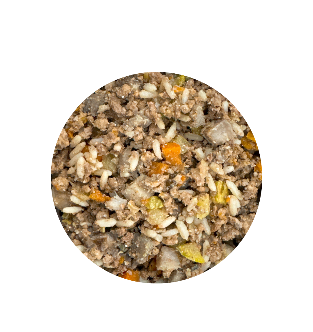 Composição básica: Coração de Bovino, Língua de Bovino, Carne de Bovino, Arroz Parboilizado, Abobrinha, Cará, Cenoura, Óleo de Girassol, Óleo de Linhaça, Salsinha Moída, Sal, Ácido Fólico, Ácido Pantotênico, Biotina, Calcário Calcitico, Dióxido de Silício, Fosfato Bicálcico, Pantotenato de Cálcio, Colina, D- Pantotenato de Cálcio, D – Alfa – Tocoferol, Extrato de Alecrim, Extrato de Chá Verde, Farinha de Algas, Iodato de Cálcio, Niacina, Oxido de Zinco, Selenito de Sódio, Sulfato de Manganês, Sulfato de Ferro, Sulfato de Cobre, Vitamina A, Vitamina B1, Vitamina B2, Vitamina B6, Vitamina B12, Vitamina C, Vitamina D3, Vitamina E, Vitamina K3, Zéolita.