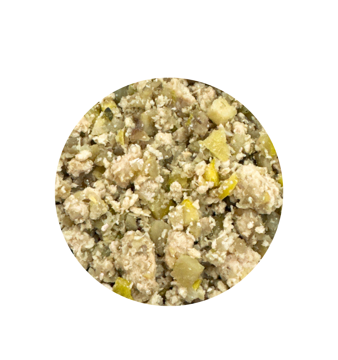 Composição básica: Carne de Peru, Batata Doce, Chuchu, Abobrinha, Óleo de Girassol, Óleo de Linhaça, Sal, Ácido Fólico, Ácido Pantotênico, Biotina, Calcário Calcitico, Colina, D- Pantotenato de Cálcio, D – Alfa – Tocoferol, Extrato de Alecrim, Extrato de Chá Verde, Farinha de Algas, Iodato de Cálcio, Niacina, Oxido de Zinco, Selenito de Sódio, Sulfato de Manganês, Sulfato de Ferro, Sulfato de Cobre, Vitamina A, Vitamina B1, Vitamina B2, Vitamina B6, Vitamina B12, Vitamina C, Vitamina D3, Vitamina E, Vitamina K3, Zéolita.